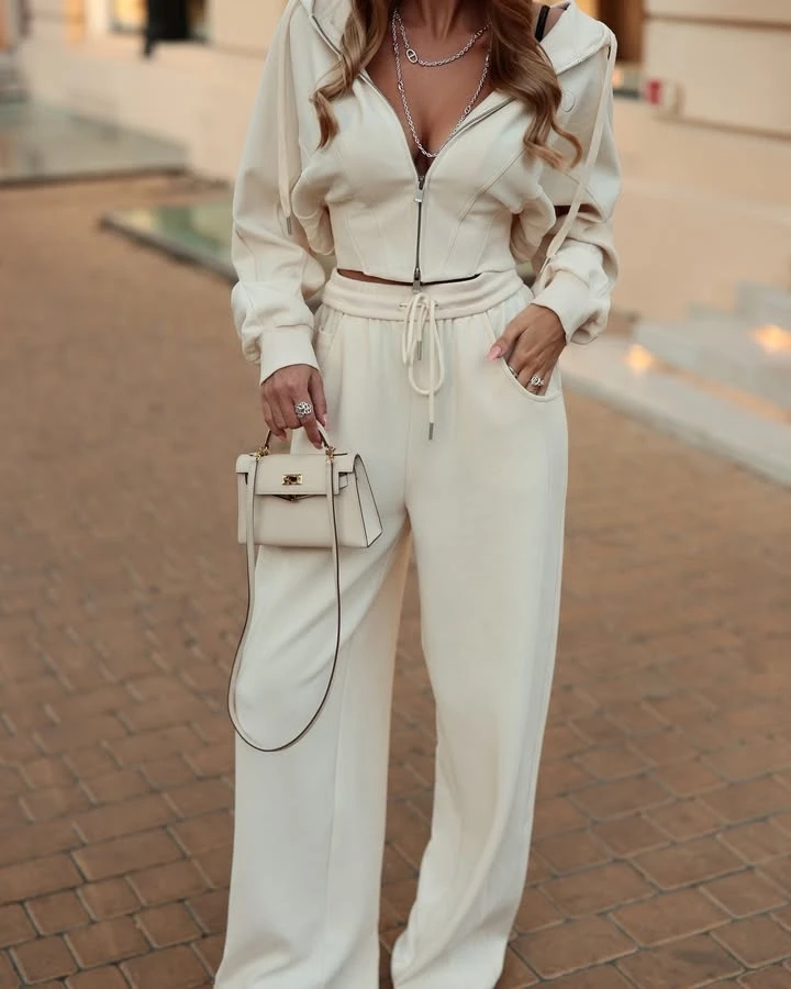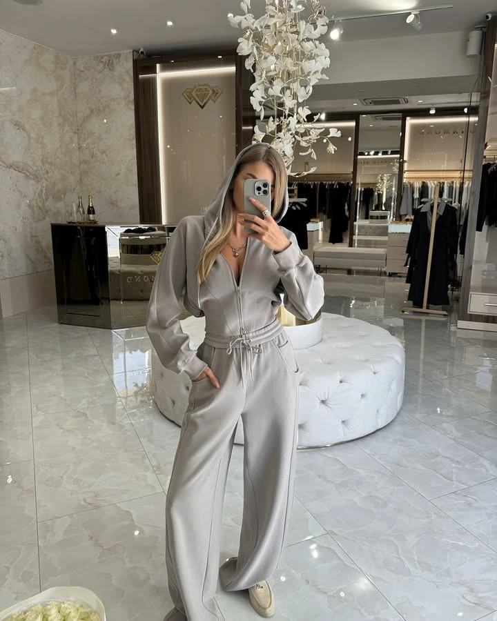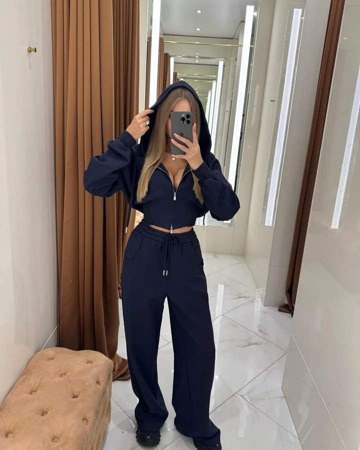 Este conjunto é composto por duas peças - um moletom com capuz e calças - proporcionando uma combinação versátil e confortável.