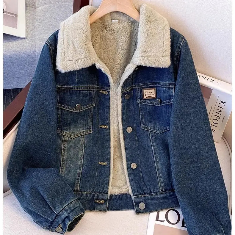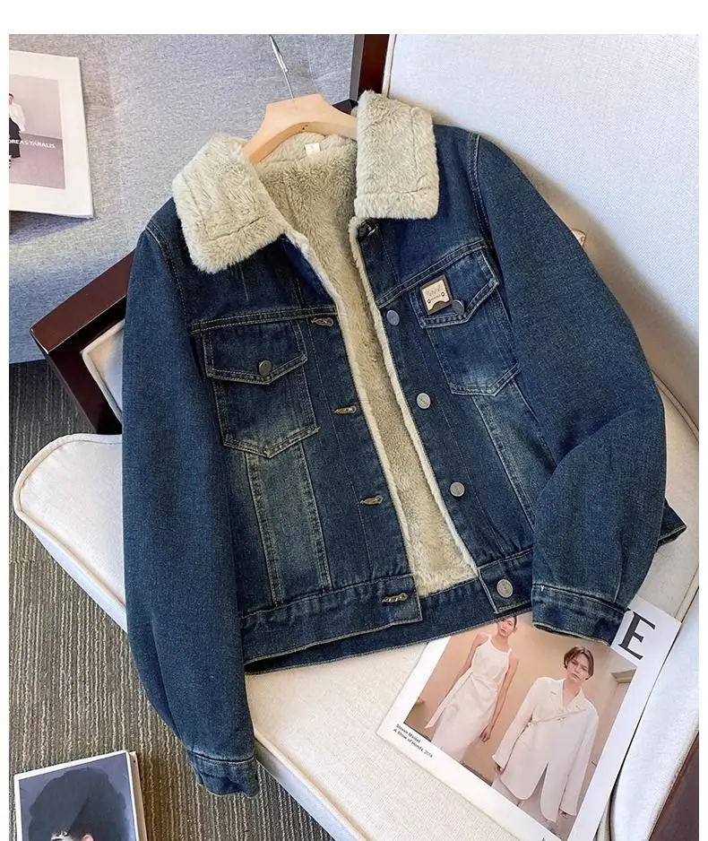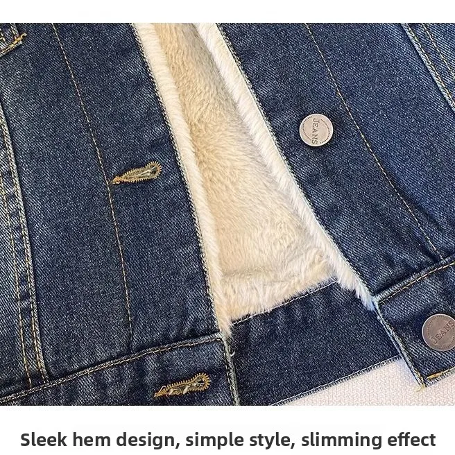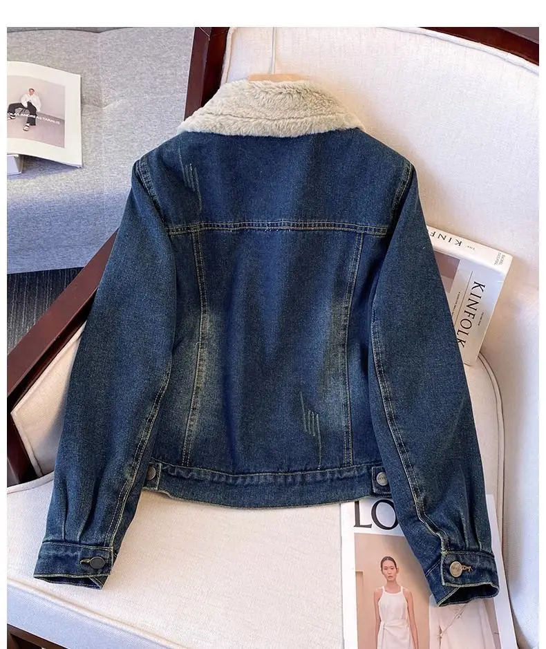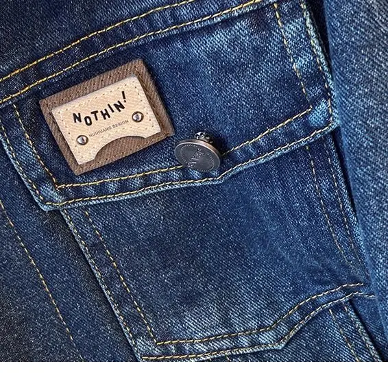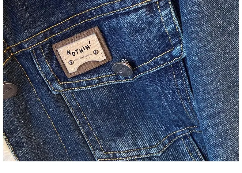 Este casaco de jeans azul é de estilo simples, perfeito para quem gosta de looks elegantes e modernos.