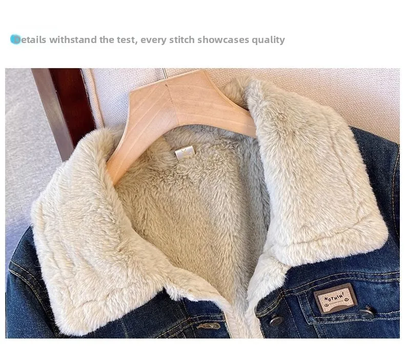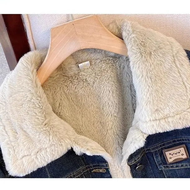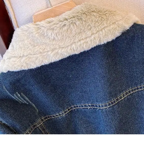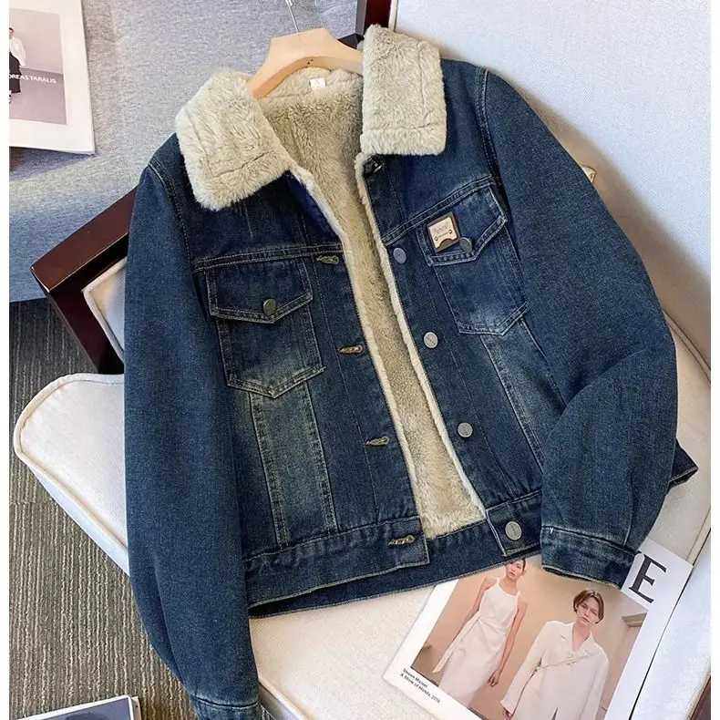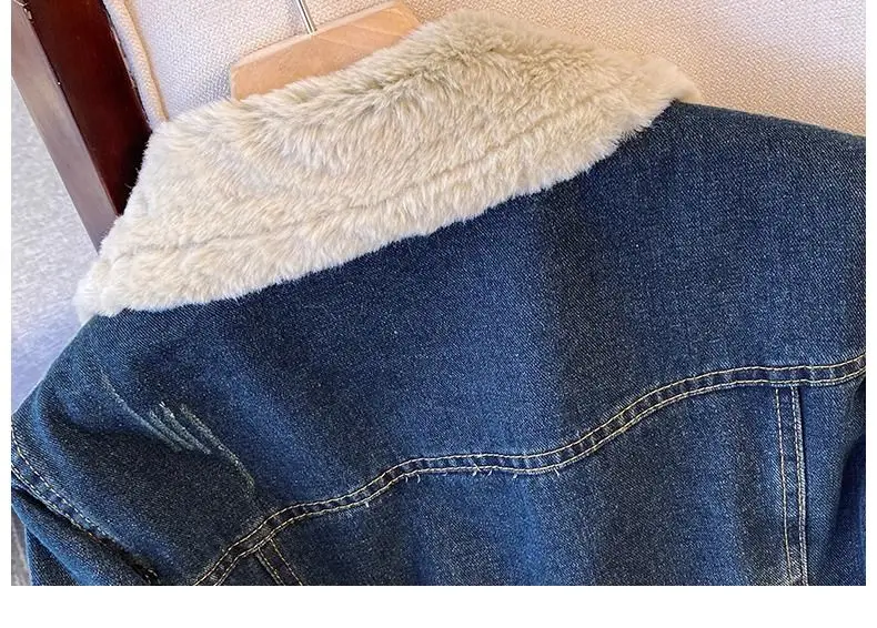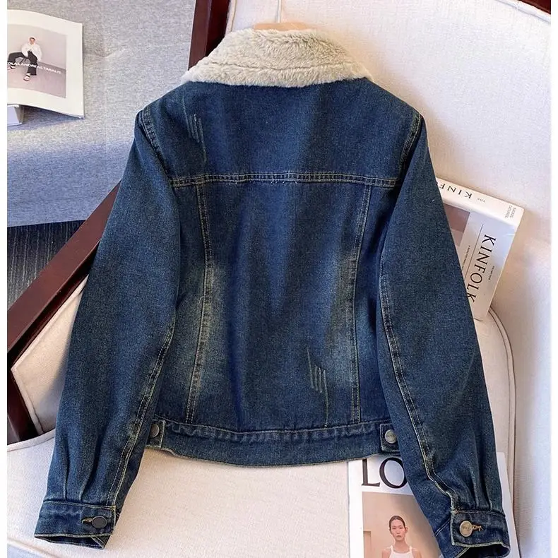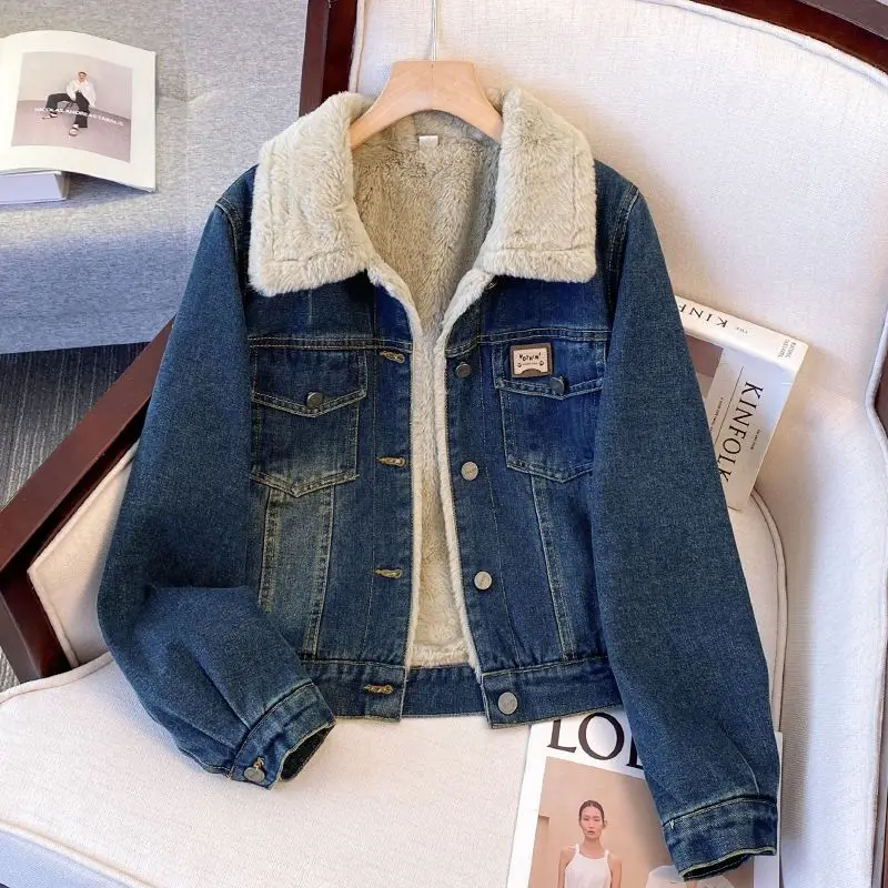 Este casaco de jeans azul é de estilo simples, perfeito para quem gosta de looks elegantes e modernos.